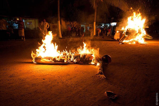 Незадолго до полуночи фигуры наиболее нелюбимых персонажей были хорошенько избиты и сложены штабелями посреди улицы. Ровно в двенадцать их облили бензином и подожгли. Весь город осветился многочисленными кострами, через которые начали прыгать нетрезвые туристы. Веселье продолжалось всю ночь.