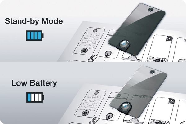 Выглядит эта идея как-то слишком фантастично даже для концепта. Ее авторы предлагают простое напоминание о зарядке телефона — переключение «обычного» AMOLED-дисплея в монохромный режим экрана, изготовленного по технологии E-Ink. Этот же монохромный режим используется для экономичного режима работы телефона. Остается только догадываться когда наступят те интересные времена, при которых электронная начинка аппарата, включая батарею, можно будет сделать либо прозрачной либо такой маленькой, что они смогут прятаться в навигационной кнопке аппарата. Но выглядит аппарат на картинке, безусловно, красиво.
