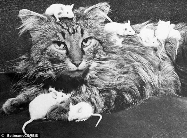 16. Странная дружба: 4-х летняя кошка Флаффенс расслабляется, пока мама-мышь и семеро ее мышат используют ее как мягкую игровую площадку, 1955 год.