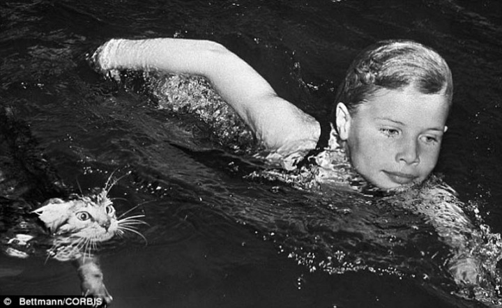 11. Бесстрашный пловец: котенок 2,5 месяцев прыгнул в бассейн в Санта Монике, Калифорния и проплыл целых 12 метров вместе со своей 10-летней хозяйкой, 1956 год.