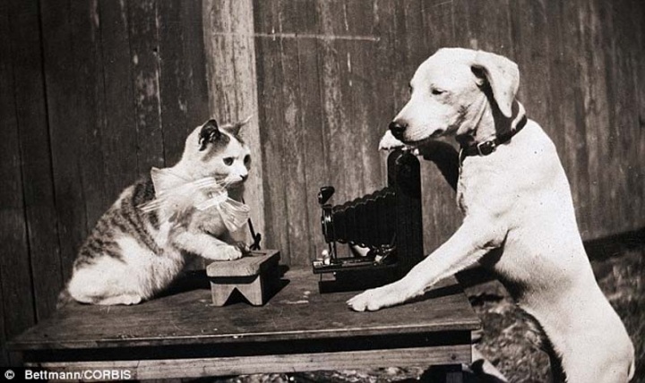 4. «Замри!»: коту Тиму сложно усидеть на месте, пока его «фотографирует» пес Лэдди, потому что он заметил пробегающую мимо мышь. Фото 1920-х годов.