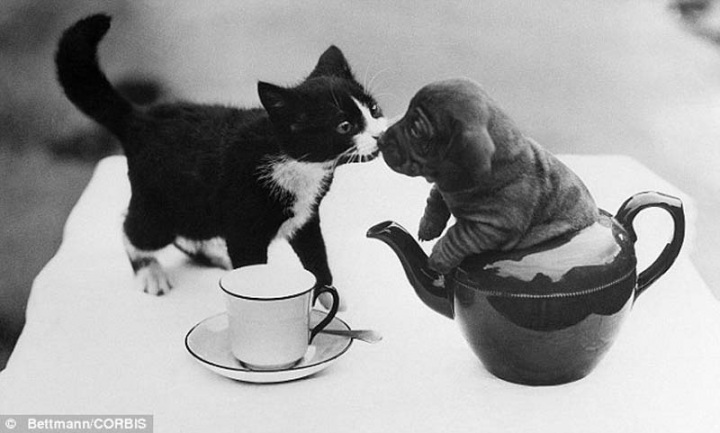 25. Щенячья любовь: щенок таксы Ханс целует котенка, сидя в чайнике, 1926 год.