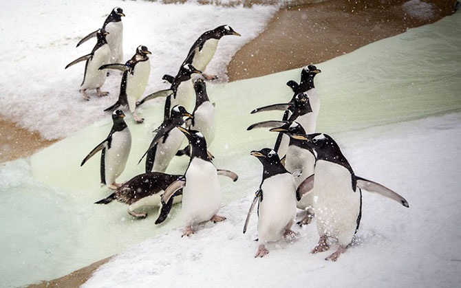 Пингвины в Эдинбургском зоопарке исследуют их обновленный корпус.