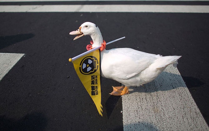 Утка идет с флажком «Нет атому» во время антиядерного митинга в Тайбэе, Тайвань.
