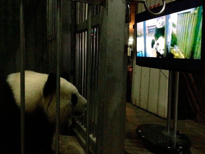 Самка гигантской панды по имени Ke Лин смотрит видеозапись спаривания гигантских панд на научно-исследовательской базе по разведению гигантских панд Чэнду, провинция Сычуань, Китай. По словам сотрудников научно-исследовательской базы, они показали Ke Лин это видео, пытаясь дать ей понять, как спариваются панды, так как она отвергала своего партнера, панду Ен Ен с гор, несмотря на то, что у неё была течка. После просмотра этого видео Ke Лин и Ен Юн успешно спарились.
