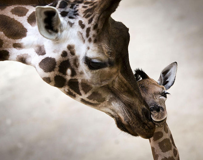 Малыш жирафа Катя, которая родилась 2 января, прислонилась к своей маме в зоопарке Опеля в Кронберге, Германия. Животное принадлежит к редкому подвиду жирафа Ротшильда.