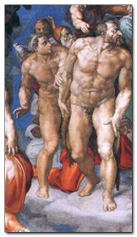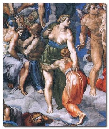 Еще более ужасной, словно приклеенной, выглядит грудь ‘женщины’ на фреске «Страшный суд», которая украшает собой алтарную стену Сикстинской Капеллы: