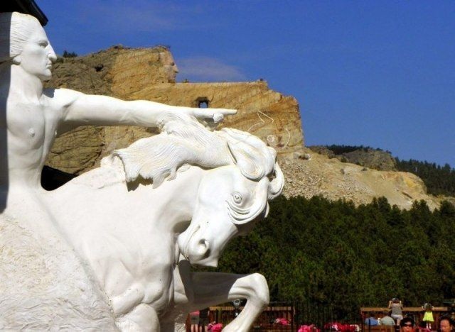 Скульптура Корчака Зюлковски (Korczak Ziolkowski) изображает знаменитый эпизод в истории американских индейцев, когда бледнолицый спросил у воина племени краснокожих Оглала Лакота (Oglala Lakota) по имени Неистовый Конь (Crazy Horse): “И где теперь твои земли?”, на что Неистовый Конь указал вдаль и ответил завоевателю: ”Мои земли там, где моя могила”.