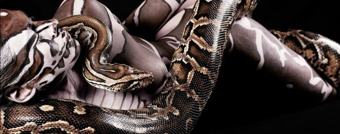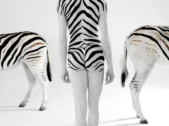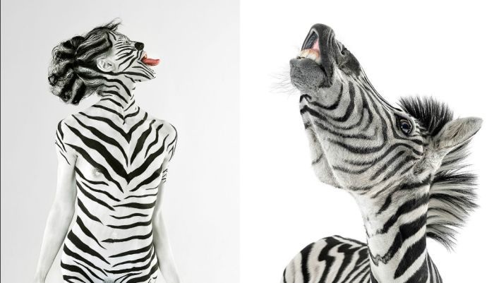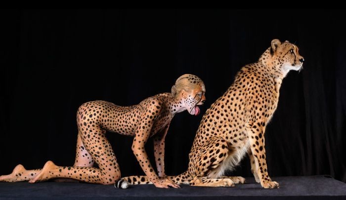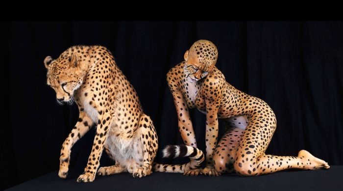 Фотограф Леннетт Ньюэлл провел фотосессию с участием животных и обнаженных моделей, при этом тела моделей были раскрашены в цвета тех или иных представителей животного мира.