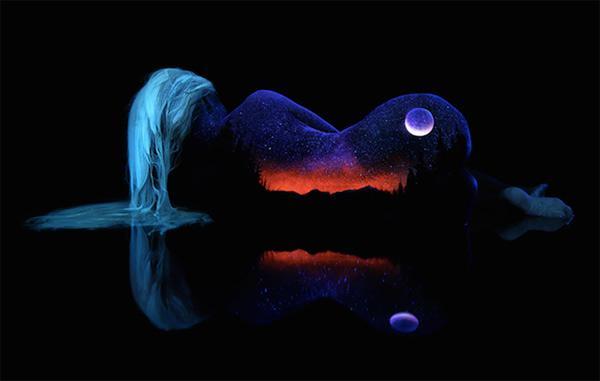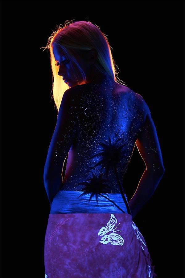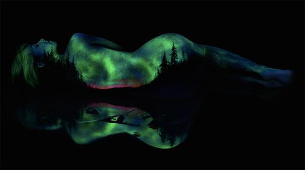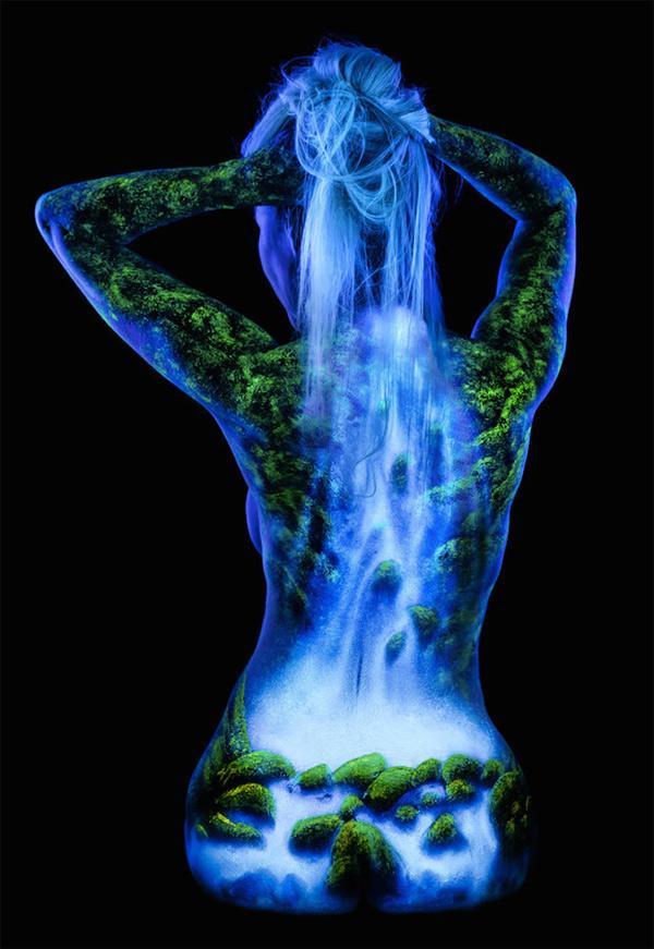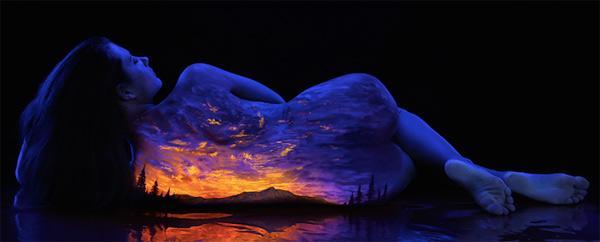 Джон Попплтон рисует флуоресцентных красками на теле потрясающие пейзажи, подчеркивая естественную красоту женского тела картинами.
