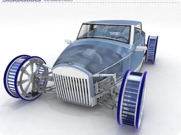 Ретро-концепт французского художника и дизайнера Тьери Дюма напоминает спортивные «Форды» 30-х годов прошлого века, однако весьма современен с технической точки зрения. Его аккумуляторы, часть гибридной силовой установки, подзаряжаются с помощью… ветра.
