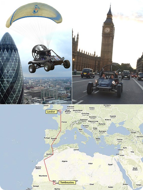 Skycar в Лондоне (в реальности) и над ним (увы, только на компьютерном рисунке). Внизу – маршрут путешествия (фото и иллюстрация Skycar Expedition).