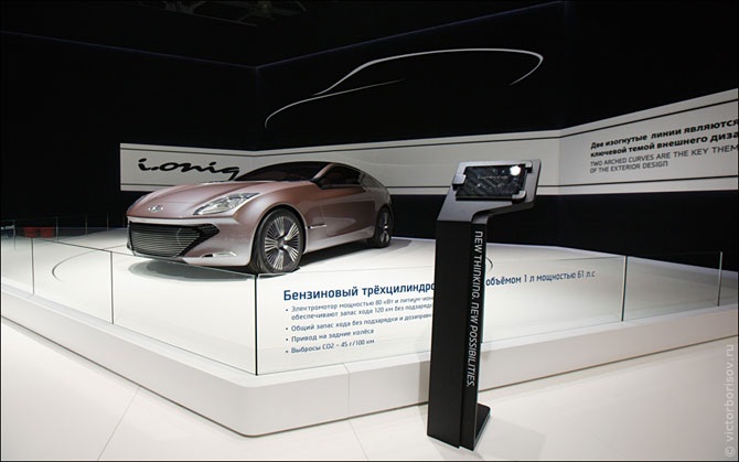 Стенд Hyundai. Не будем придираться к оформлению стенда таким образом, что прочитать описание мешает стойка, так же как и слишком контрастное оформление с чёрными стенами и белым полом, когда находишься на стенде, ощущается дискомфорт. Собственно про концепт — суммарный запас хода 700 км, при этом на электротяге он сможет проехать не более 120. Очевидно, что остальные 500 километров он будет медленно и неспешно передвигаться приводимый в движением «дохлым» бензиновым двигателем.