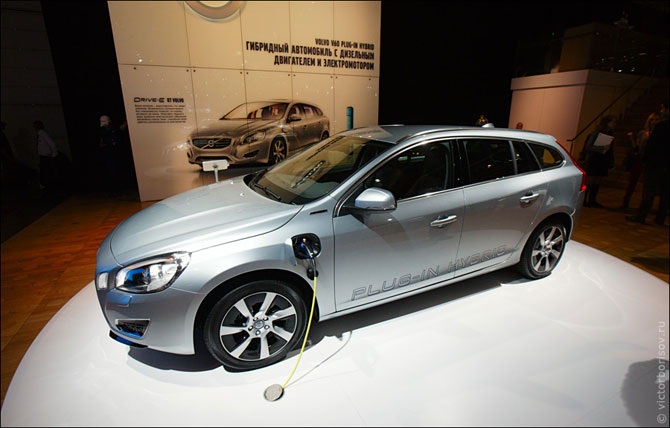 Volvo показала два подключаемых гибрида V60 (на фото) и XC60. Это первый в мире гибридный электромобиль с дизельным двигателем и зарядкой батарей от бытовой электросети. Ещё на стенде можно увидеть высокотехнологичный концепт-кар Concept You, напичканный мониторами и сенсорными экранами.