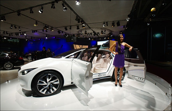 Первый стенд — Infiniti. На фото концепт Etherea, на основе которого в самое ближайшее время появится компактная модель премиум-класса. Под капотом гибридный силовой агрегат (2,5 литра бензин с турбонаддувом и электромотор) и впервые для марки Инфинити привод на переднюю ось. Также на автосалоне прошла европейская премьера кроссовера Infiniti JX.