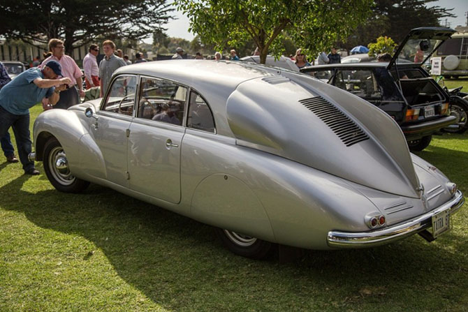 Этот красивый автомобиль Tatra P87 был частью Concours d’Elegance в Pebble Beach в воскресенье, зрители тепло встретили его и в субботу.