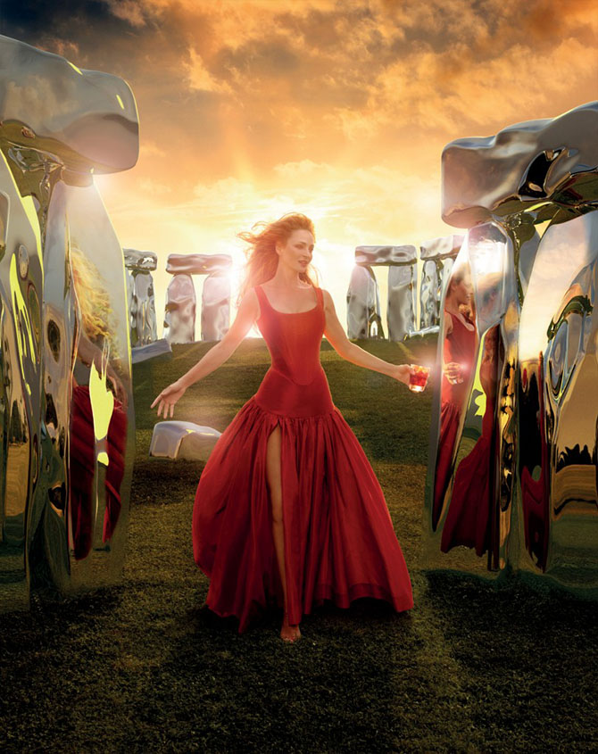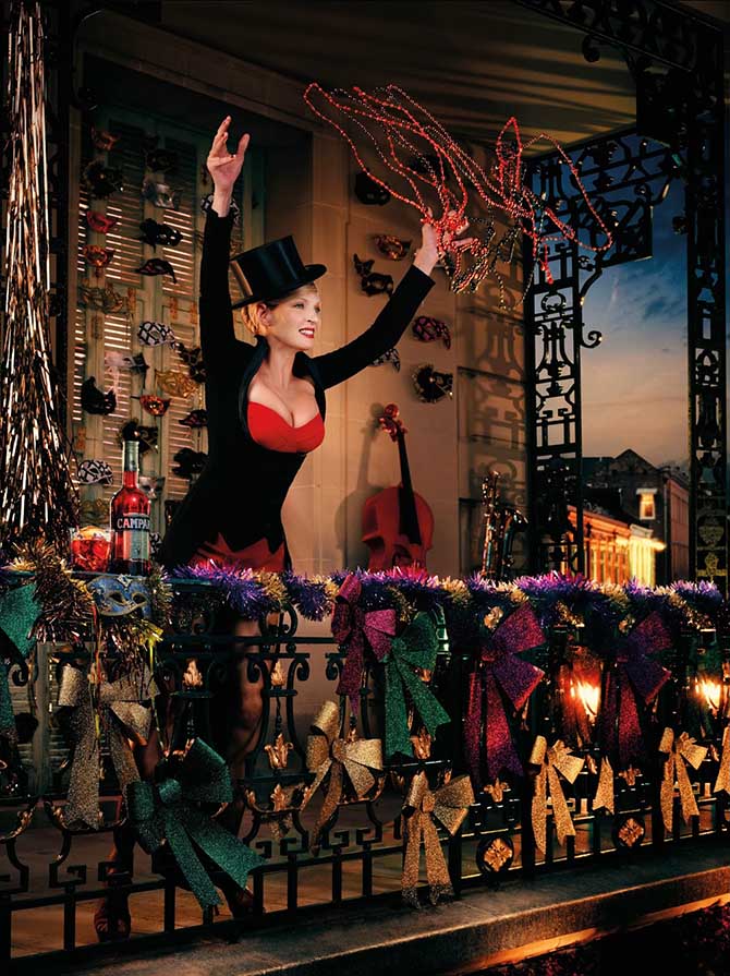Съемки для 15-го юбилейного календаря Campari проводил фэшн-фотограф Кото Болофо. Ума Турман демонтстрирует наряды Emilio Pucci, Atelier Versace, Alberta Feretti, Stella McCartney, Zac Posen, а также специально созданные для нее платья, которые стилисты дополнили обувью итальянской марки Salvatore Ferragamo и украшениями Chopard.