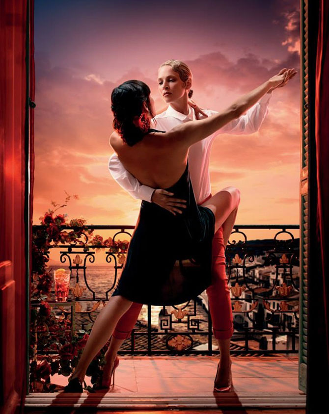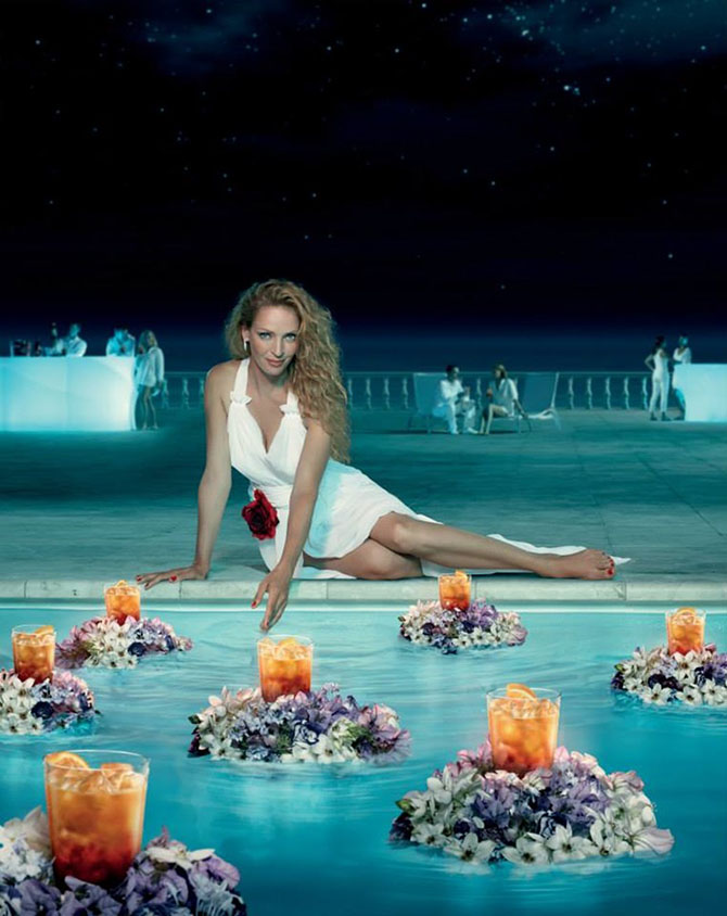 Неизменными на всех снимках остаются лишь красные детали гардероба Умы, отдающие дань ключевому ингредиенту кампари — алому красителю из крыльев мушки кошенили.