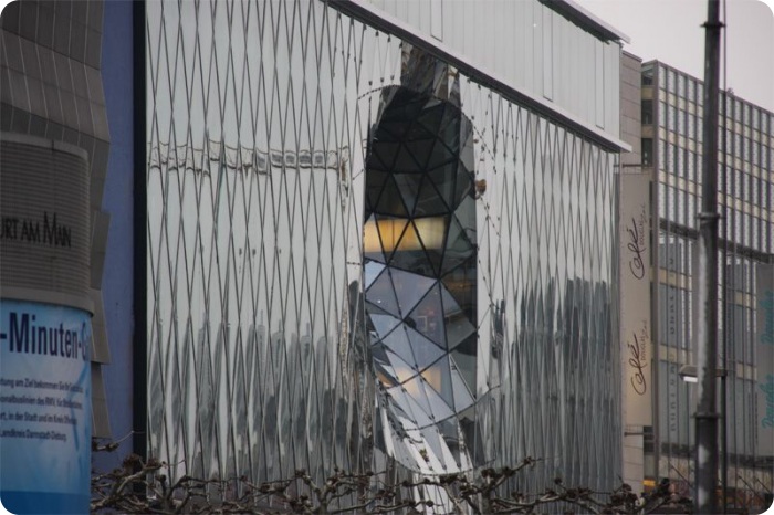 Это странное здание входит в состав ансамбля новой застройки Palais Quartier. Найти это здание просто, достаточно придти на главную торговую улицу города под названием Цайль.