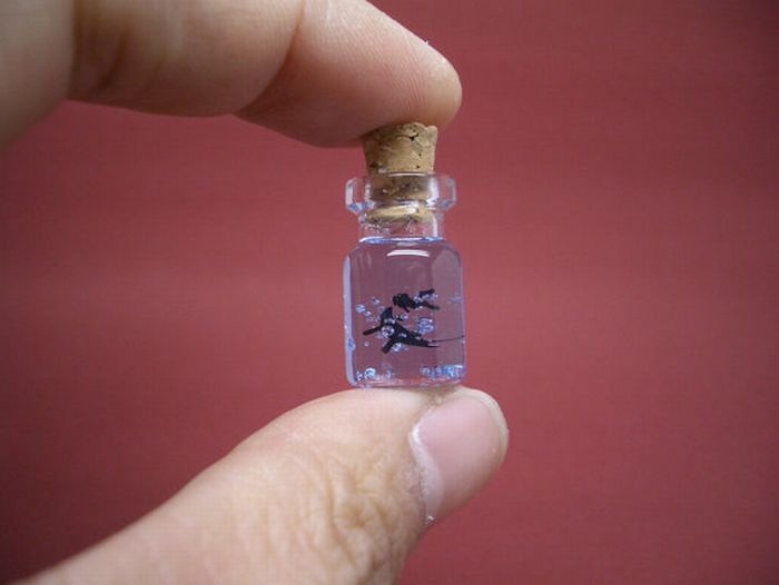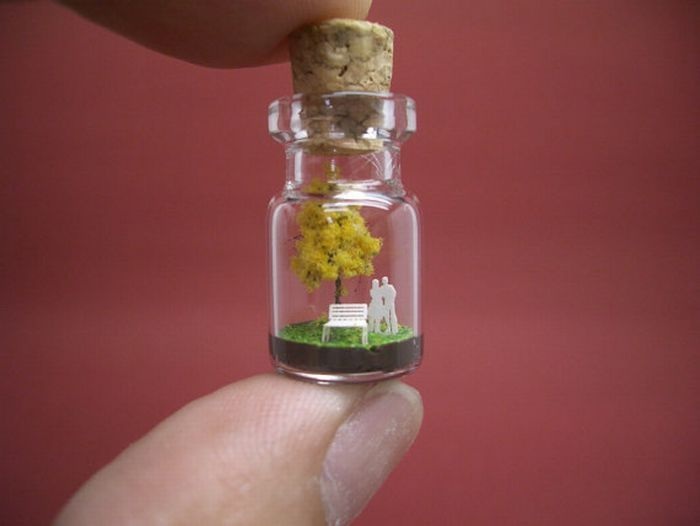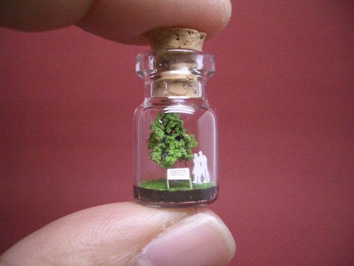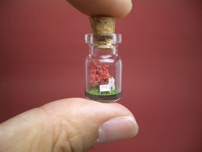 Акинобу Изуму – японский художник, фотограф, создает удивительные миниатюры. Искусство создание миниатюр в пустых бутылках, довольно распространено, этим занимаются тысячи и тысячи людей по всему миру. Однако, Акинобу, в своем проект “Крошечный мир в бутылке”, пошел дальше: он создает миниатюры в очень маленьких бутылочках. Высота бутылочки-колбы, в которой художник создает свои миниатюры, составляет всего лишь 22 миллиметра в высоту и 12 миллиметров в ширину! Это удивительно и невероятно, но Акинобу удается соорудить целый мир. На создание одной миниатюры требуется десятки часов напряженной и кропотливой работы.