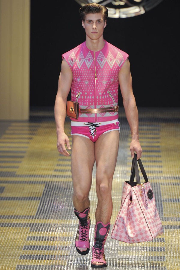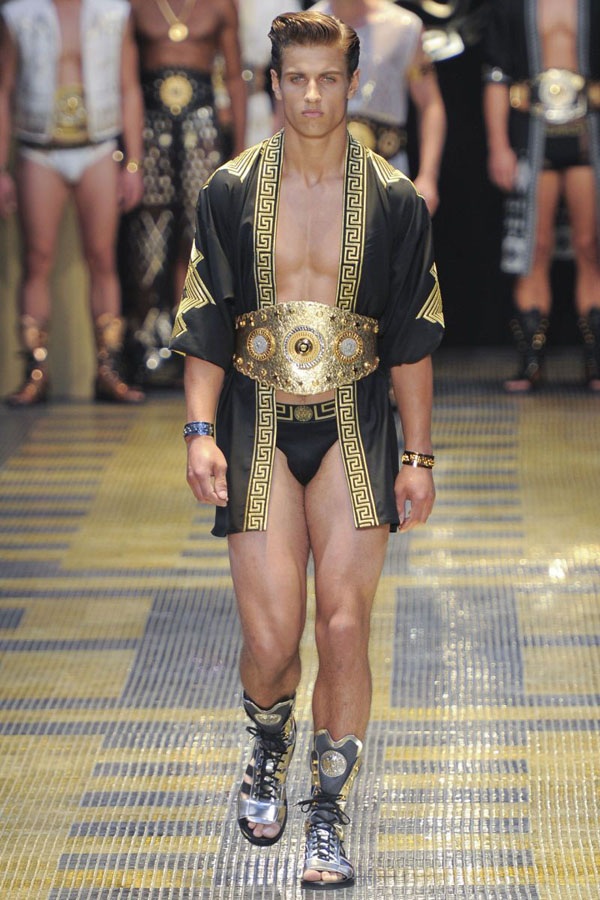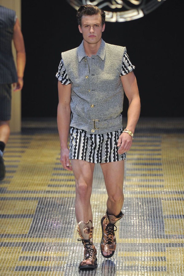 Помимо гладиаторских костюмов были представлены и модели casual, к примеру, Донателла предложила поклонникам марки большой выбор костюмов. Примечательной деталью стали крупные золотистые пуговицы на пиджаках и жилетах. Любопытны и аксессуары – сумки, пристегнутые к одежде на манер кобуры, выполненные из кожи металлических оттенков. Вообще, металлического блеска в этой коллекции хватает – дизайнер не сдерживала себя.