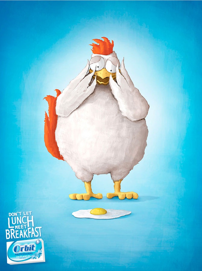 Жевательная резинка Orbit: Не дай обеду встретиться с завтраком. Отличный выбор цвета и иллюстрации гармонично сочетается с �дурацким� слоганом. Креатив агентства Gitam BBDO.