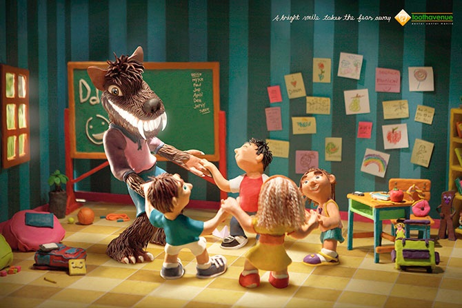 Яркая улыбка волка убивает страх детей на рекламном принте стоматологии. Пластилиновая реклама вызывают четкие ассоциации с игрой, весельем, радостью и хорошим времяпрепровождением. А что еще нужно, чтобы заставить ребенка пойти лечить зубы?