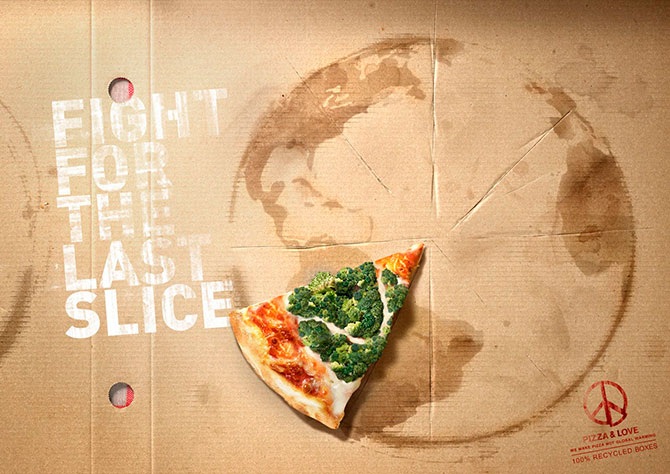 Рекламой �Сражайтесь за последний кусочек� пиццерия анонсировала выпуск экологически чистой упаковки и переход на использование исключительно органических продуктов для приготовления пиццы. Лес из брокколи на последнем кусочке пиццы сигнализирует о важности сохранения лесов. Внимательный потребитель заметит, что логотип в нижнем правом углу – это не пацифик, а пицца.