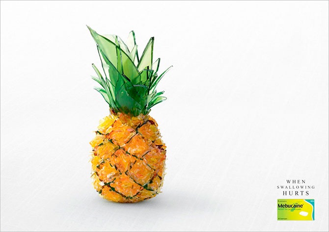 Каждому, кто хоть раз болел ангиной, станет близка и понятна реклама Mebucaine. Каждый глоток – словно стеклом по воспаленному горлу. Ананас из стекла – удачное сравнение, хорошая реализация идеи.