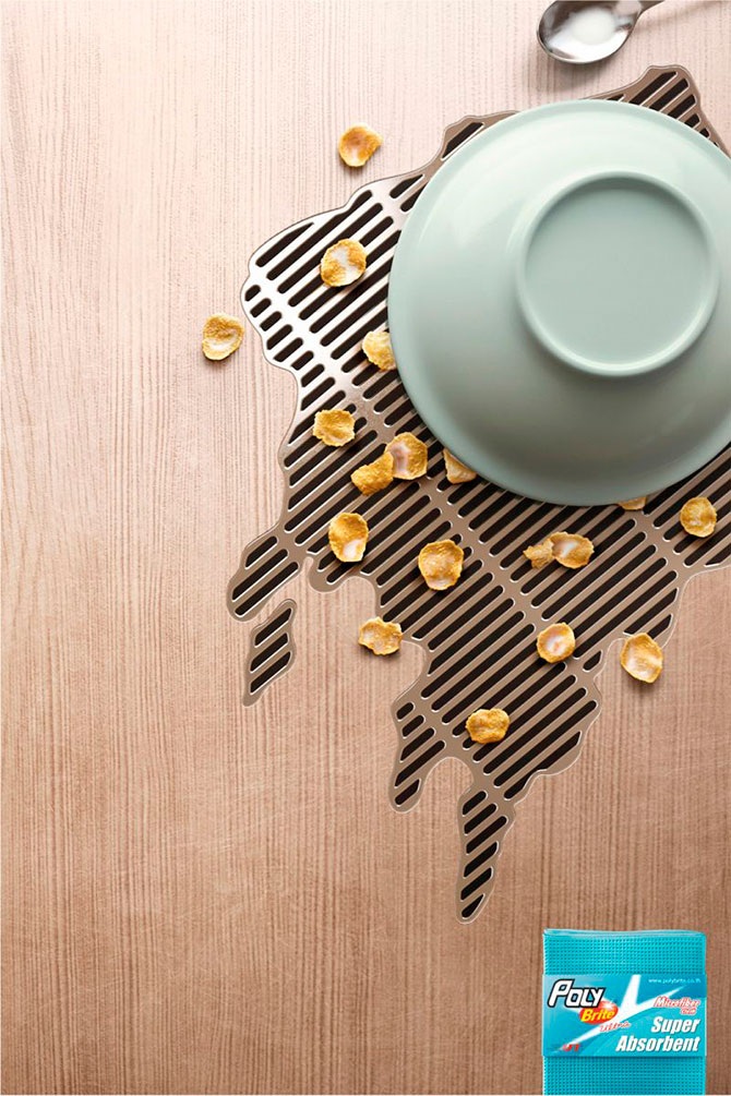 Реклама супер-впитывающих салфеток Poly-Brite. Жидкость словно уходит сквозь щели решетки. Креатив принадлежит агентству Ogilvy & Mather.
