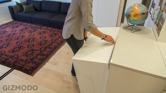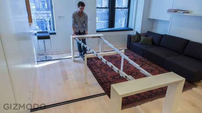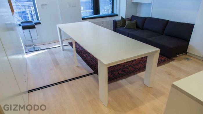 Почти квадратная форма квартиры вместила гостиную и офис, которые превращаются в спальню, а также телескопический обеденный стол и стулья, прячущиеся в модульном шкафу.