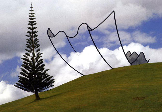 Ричард Серра – «Контур Те Тухиранги». Эти стальные плиты наклонены на 11 градусов от вертикальной оси и имеют единый контур. Автор говорит, что скульптура как будто «собирает объем земли».
