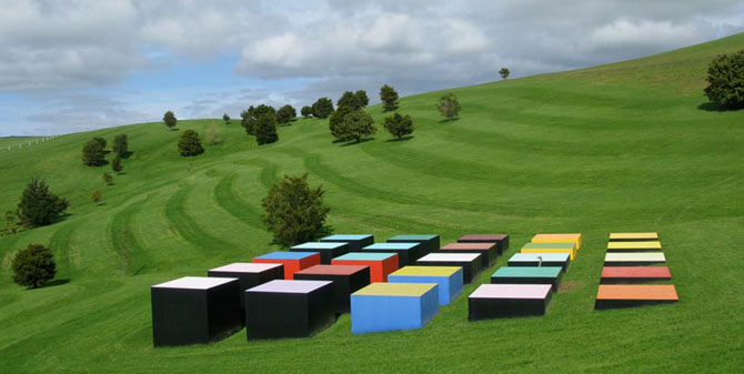 Леон Ван Ден Эйкель – «Бой красных облаков на ландшафте». Эта скульптура основана на трех главных цветах – красном, желтом и голубом – и их сочетаниях. Скульптор так выразил своеобразный диалог между европейским модернизмом и природой южного полушария.