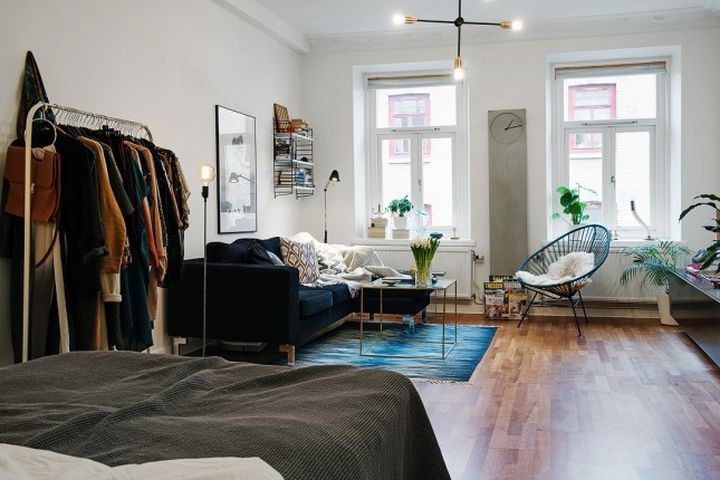 Да, стены лучше оставить белыми, но это не означает, что стоит вовсе отказаться от ярких цветов в дизайне квартирки-студии. Оставьте цветные акценты таким мелочам, как одеяло на кровати или накидка и диванные подушки.