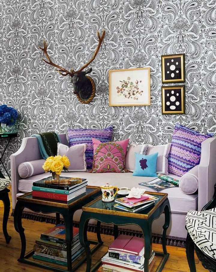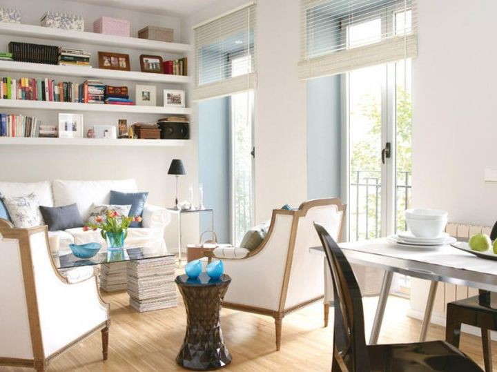 С просто идеальным балансом между белым и голубым, эта комната выглядит сказочно. Обратите внимание на креативный журнальный столик, сделанный своими руками — его ножки на самом деле модные журналы, а сверху закреплено стекло.
