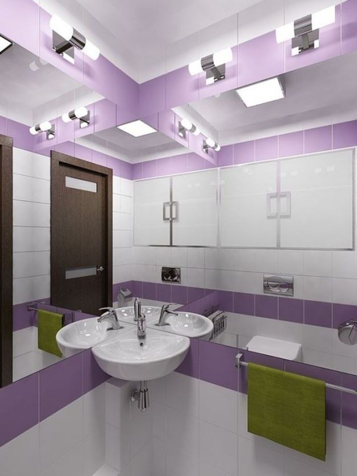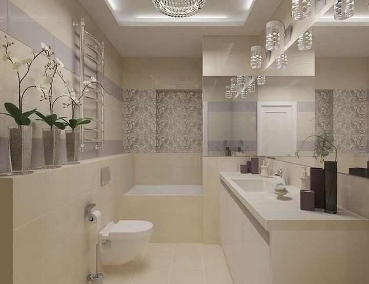Другой немаловажный момент – направление рисунка. Вертикальный рисунок визуально увеличивает помещение в высоту, горизонтальное – в ширину. В пару с крупной плиткой в санузле можно использовать натяжной белый глянцевый потолок, который также увеличит пространство. Эффектно будет смотреться и контрастный по отношению к стенам пол.