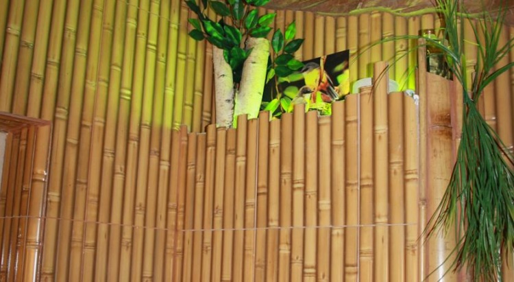 Начнем с самого сладкого – спальни! Подиум, обитый искусственным газоном, на котором лежит матрас, украшенный плюшевыми хвостами енотов! На стене фотообои, вокруг – пластиковые пальмы! Если много выпить, то можно подумать, что засыпаешь в лесу!