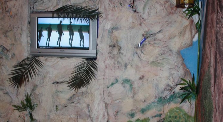 Телевизор вмонтирован в скалу! Странно, что здесь не гнездятся птицы. Если бы здесь жил попугай, он мог бы сразу учиться всему хорошему у телевизора. Думаю, что автор этой инсталляции хотел обратить внимание на преемственность поколений, обозначить чёткую связь между наскальной живописью и постмодерном.