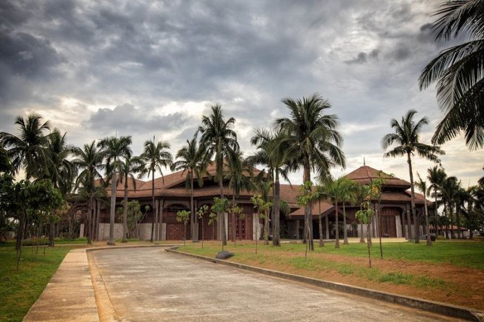 Ключевая особенность сооружения состоит в использовании кокосовой пальмы в качестве основного материала для строительства. Здание так и называется – Кокосовый дворец или Tahanang Pilipino. Крыша сделана из кокосовой черепицы, опоры взяты из самых прочных стволов кокосовой пальмы. Внутри дворца на полу лежит кокосовый паркет, поверх которого расположились ковры из кокосового волокна. В то же время, на стенах поклеены обои из кокосовой фиброзной оболочки. Светильники и люстры сделаны из кокосовых орехов, а обеденный стол покрыл десятками тысяч кусочков все тех же орехов кокоса. Дворец был построен к приезду Папы Римского в конце прошлого века. Сейчас туда можно попасть с экскурсией.