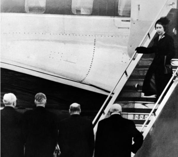 На фото запечатлен драматический момент возвращения осиротевшей Елизаветы на родную землю уже в качестве новой королевы Британии.