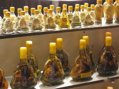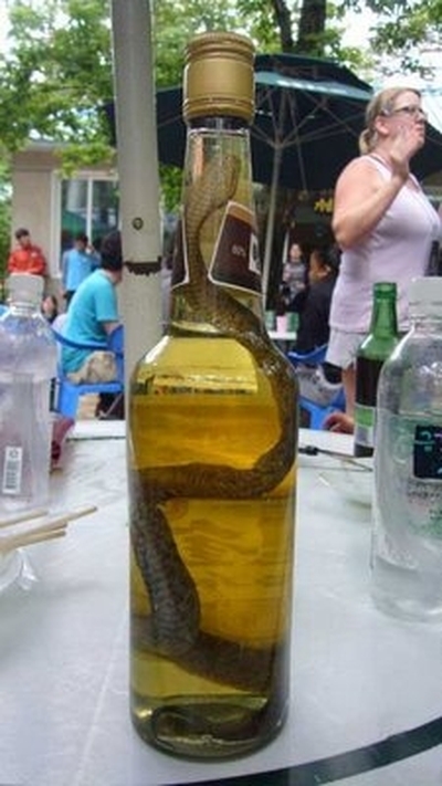 Змеиное вино представляет собой алкогольный напиток, особенностью которого является ядовитая змея в бутылке. Вино впервые сделали во Вьетнаме. Сегодня этот напиток можно найти и в других странах Юго-Восточной Азии. Змеи в качестве главного ингредиента этого вина, как правило ценятся не из-за своего мяса, а из-за змеиного яда, растворенного в спирте.
