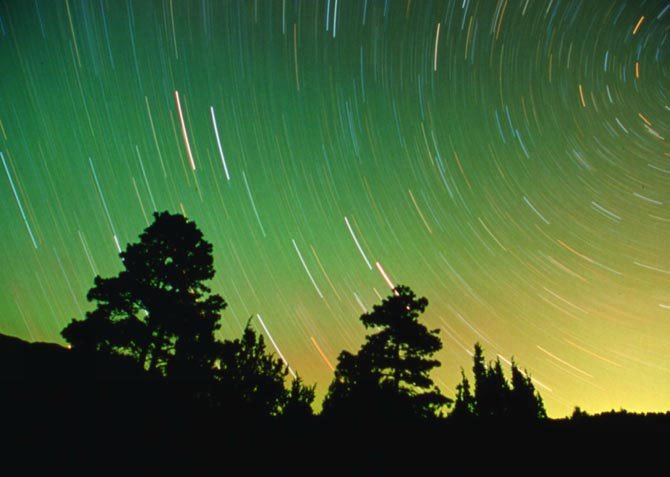 Наглядная демонстрация вращения Земли. Это явление невозможно заметить невооруженным глазом. Чтобы получить такую фотографию, необходимо поставить фотоаппарат на длинную выдержку. На снимке только Полярная звезда, расположенная практически над осью Земли, остаётся почти недвижимой.