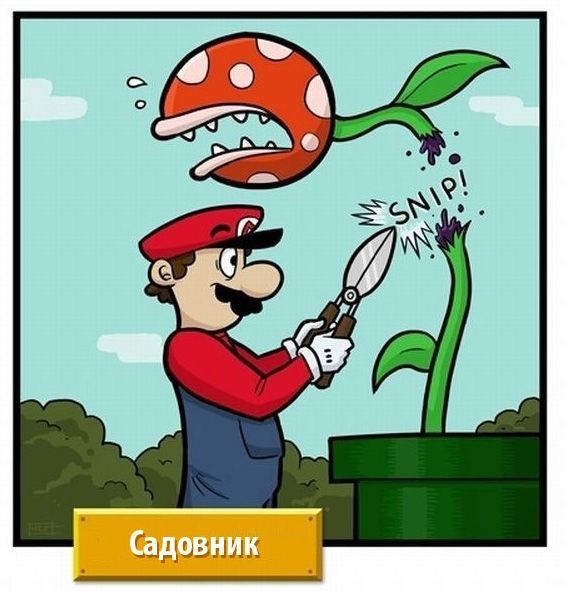 Марио — любимая игрушка нашей юности. Но сантехник не самая лучшая профессия для борьбы со сказочными монстрами. Давайте поменяем сантехнику профессию и посмотрим, как бы развивался сюжет, будь Марио плотником, пилотом, садовником, полицейским или ниндзей.