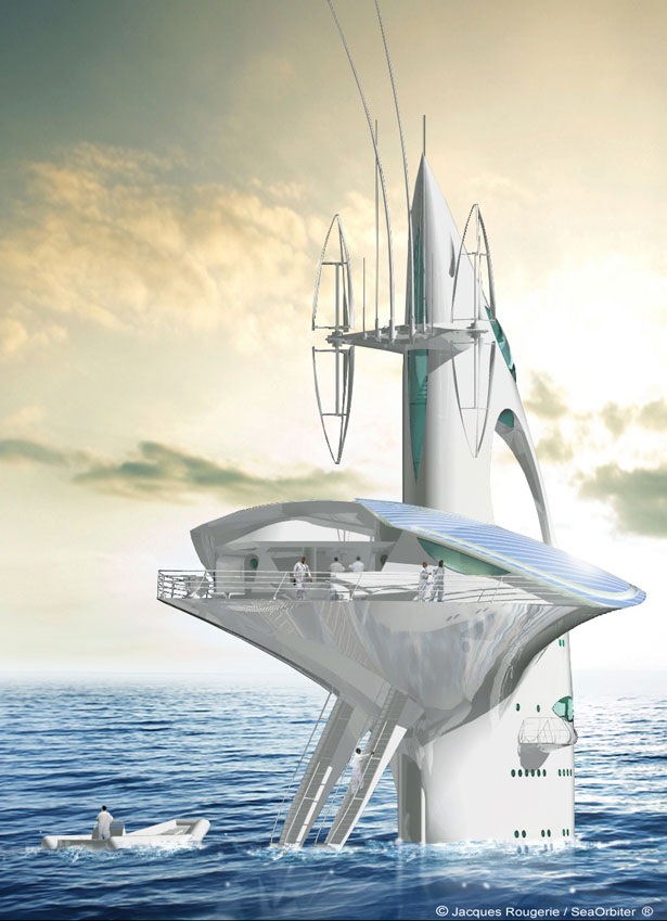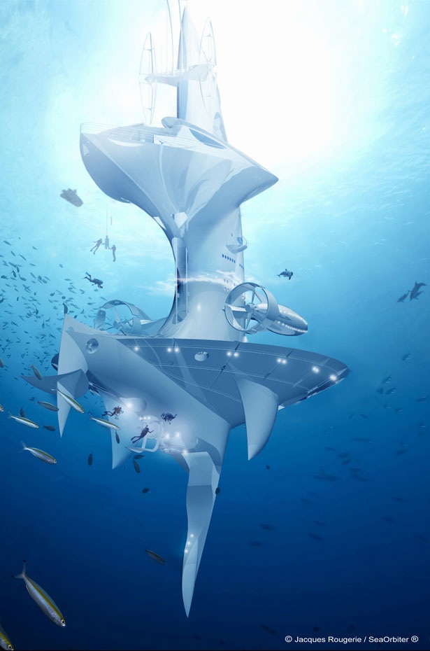 Корабль SeaOrbiter, напоминающий жилой небоскреб, имеет высоту 51 метр и способен разместить у себя до двадцати двух человек, которые смогут работать под водой 24 часа в сутки.