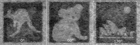 Изображения, записанные с помощью трёх различных направлений поляризации (такой подход также позволит увеличить вместимость одного диска до 7 терабайт). Длина волны одна – 840 нанометров. Сторона "рисунка" составляет 100 микрометров или 75 пикселей (фото Nature).