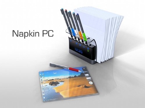 Основываясь на использовании новейших технологий в области производства дисплеев и компактных электронных компонентов, Эвери Холлеман (Avery Holleman) придумал компьютер, который поощряет пользователя на спонтанное творчество – что-то наподобие салфеток в кафе, на которых порой рождаются гениальные идеи. Основное аппаратное обеспечение находится в базовой станции, также служащей для подзарядки, а манипулятором выступает ручка-стилус. Перспективы «салфеточного» ПК выглядят достаточно отдалёнными, однако в прошлом году концепт выиграл один из конкурсов.
