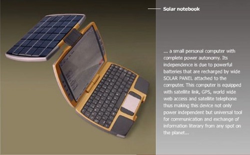 Чтобы обеспечить потребности портативного компьютера в энергии, сегодня потребуется солнечная панель немалой площади. Но постепенно мобильные ПК становятся более энергоэффективными, а КПД панелей увеличивается, поэтому дизайнер Никола Кнезевич (Nikola Knezevic) посчитал, что не за горами время устройств, для которых будет достаточно солнечного света без поддержки аккумуляторов. Элемент питания планируется крепить к верхней кромке экрана. Сам нетбук должен быть оснащён спутниковой связью и GPS, что сделает его поистине мобильным. Идея вполне осуществима, остаётся ждать дальнейшего прогресса технологий, когда компьютеру будет достаточно и лунного света.