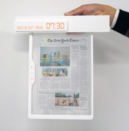 Бронзовый призёр IDEA 2009, IN – это тонкое гибкое «полотно» для чтения новостей. Устройство ночью заряжается от базовой станции в виде настенных часов, а утром готово предоставить загруженную с любого желаемого источника свежую информацию. Пользователь получает привычный газетный формат, пальцы остаются чистыми от краски газетной бумаги, нет надобности идти к киоску с прессой, не вырубаются леса…