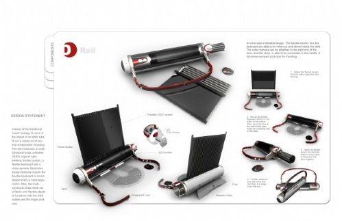 Гибкие OLED-дисплеи предоставляют грандиозные возможности инженерам, проектирующим электронные продукты. Студент Хао Хуа (Hao Hua) из Университета Пердью (Purdue University) предложил концепцию мобильного компьютера, экран которого сворачивается и помещается в небольшую трубку, выполняющую роль «системного блока» с аппаратным обеспечением. Клавиатура также выполнена из гибкой электроники. В следующем году такой ПК ждать вряд ли стоит.