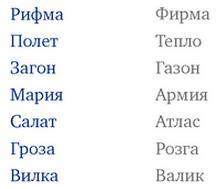 Изучите два списка слов. В правой колонке находятся анаграммы к словам из левой. Свяжите каждое слово из левой колонки с соответствующим ему из правой и запомните их.